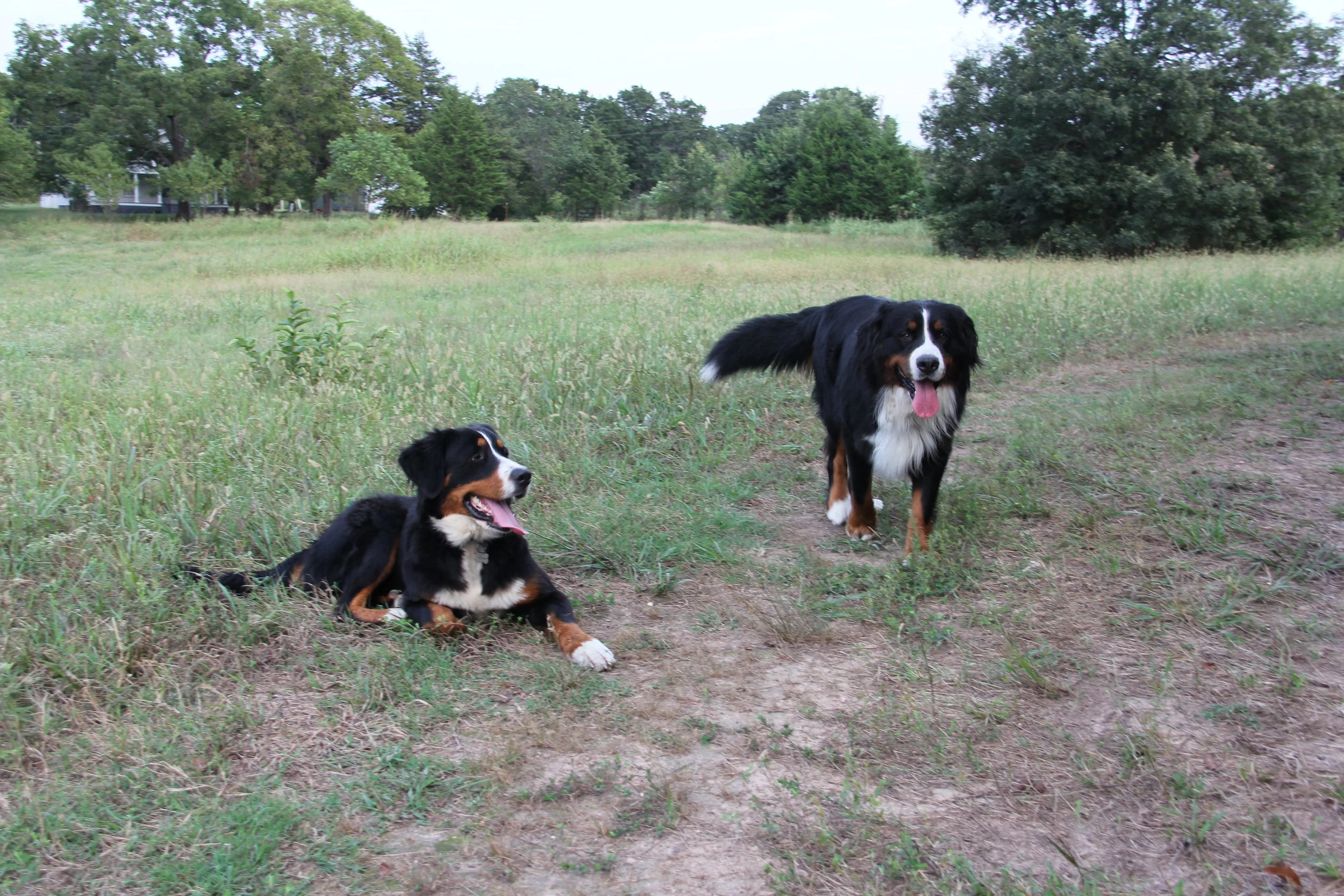 We are a small family farm and we breed Bernese Mountain Dogs in Oklahoma. We have two Bernese Mountain Dogs, Bailey and Buck. Our two Berners free range on our 30 acre farm with livestock.